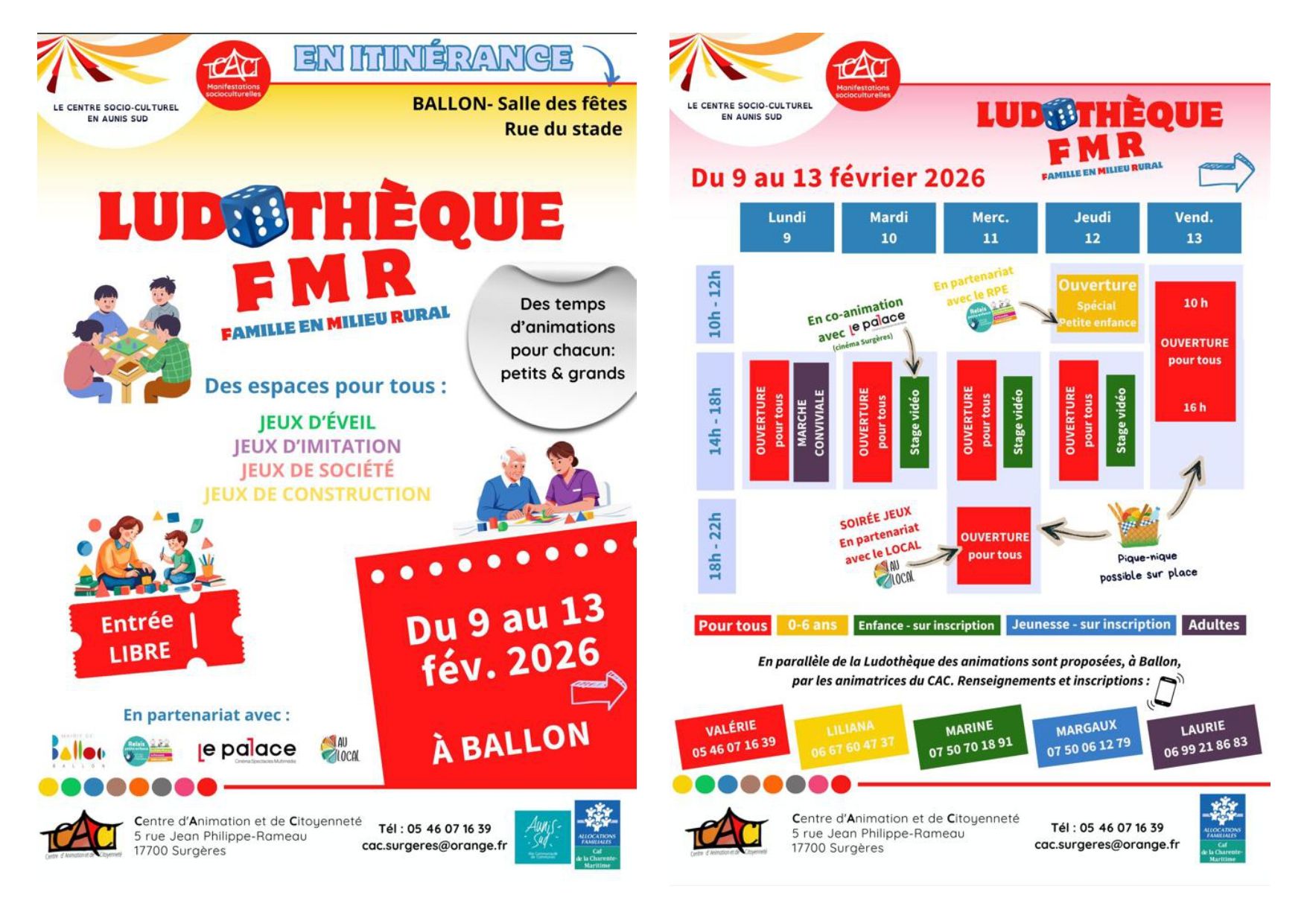 Écrit le 30 janvier 2026. Publié dans Evènements à venir Ludothèque CAC - BALLON Vues: 98 Imprimer E-mail Suivant